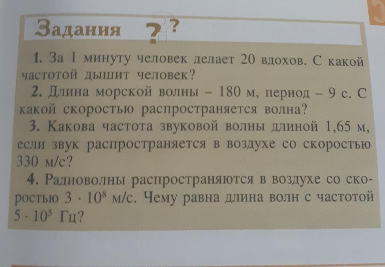 1. Частота это отношение числа вдохов к времени , поэтому 20/60=1/3 Гц