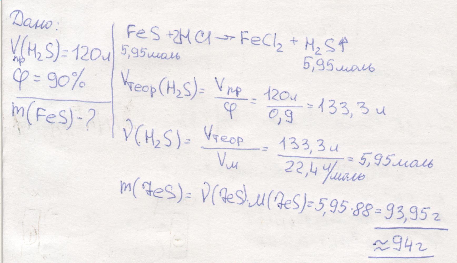 сколько граммов ферум 2 сульфида необходимо взять, чтобы получить 120 л гидрогена сульфида, если объмная доля выхода газа составляет 90%