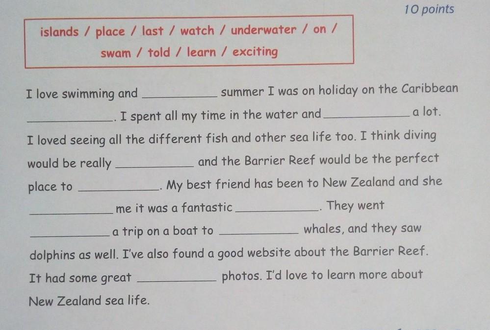 1) last; 2) islands; 3) underwater; 4) exciting; 5) watch; 6) told; 7) place; 8) on; 9) learn; 10) exciting