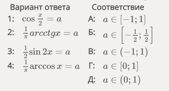 Помогите!!! Установите соответствие между уравнениями (1-4) и всеми значениями параметра a, при которых эти уравнения имеют смысл (А-Д).