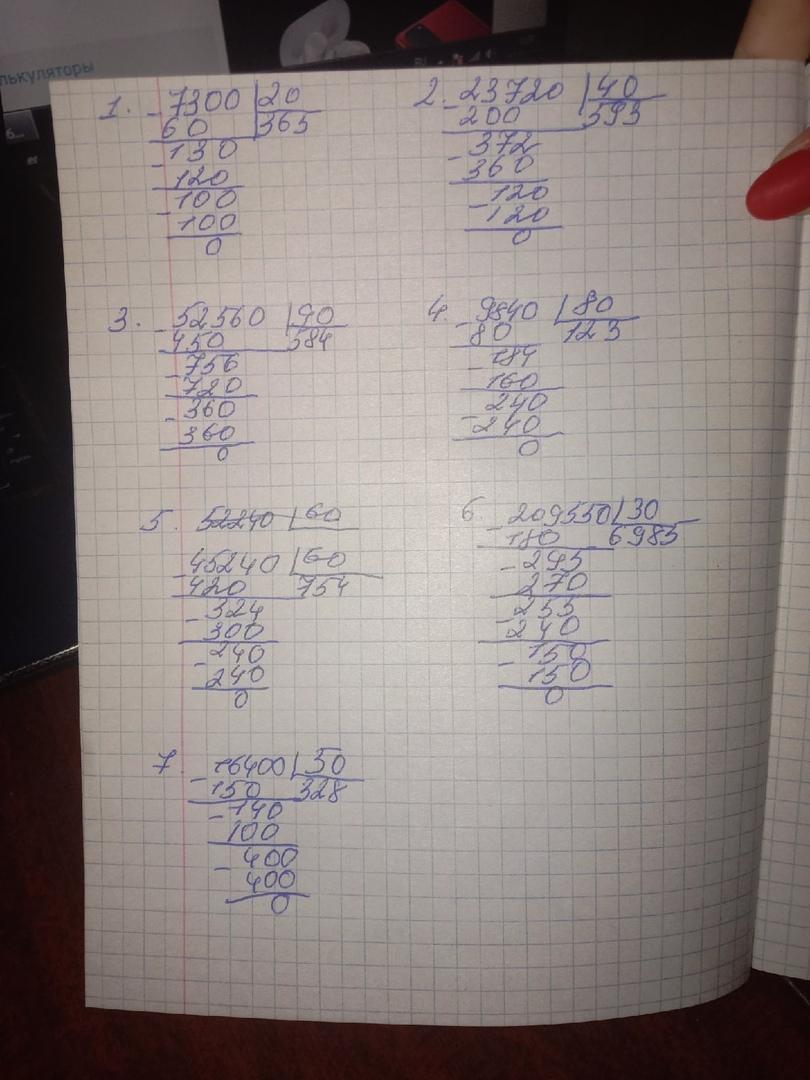 Ответ:7300:20=365; 23720:40=593; 52560:90=584; 9840:80=123; 42540:60=709; 209550:50=6985; 16400:50=328