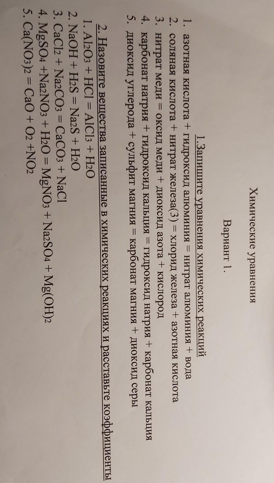 Задание 1. 1) 3HNO3+Al(OH)3= Al(NO3)3+3H20. 2) 3HCl+Fe(NO3)3= FeCl3+3HNO3. 3). 2Cu(NO3)2=2CuO+4NO2+O2. 4). Na2CO3+Ca(OH)2=2NaOH+CaCO3. 5) CO2+MgSO3=MgCO3+SO2. Задание 2. 1) Al2O3+6HCl=2AlCl3+3H20. Оксид алюминия+соляная кислота= хлорид алюминия+вода. 2). 2NaOH+H2S=Na2S+2H2O. Гидроксид натрия+ сероводород= сульфид натрия+ вода. 3). CaCl2+ Na2CO3=CaCO3+2NaCl. Хлорид кальция+ карбонат натрия= карбонат кальция+ хлорид натрия. 5) 2Ca(NO3)2= 2CaO+O2+4NO2. Нитрат кальция= оксид кальция+ кислород+ оксид азота 4