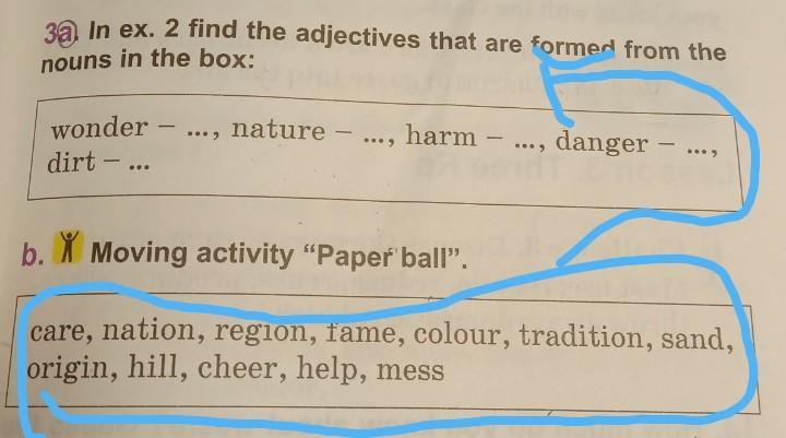 Не до конца понимаю задание, типо В примере 2 найдите прилагательные которые образованы от существительных в коробке, а где пример 2?
