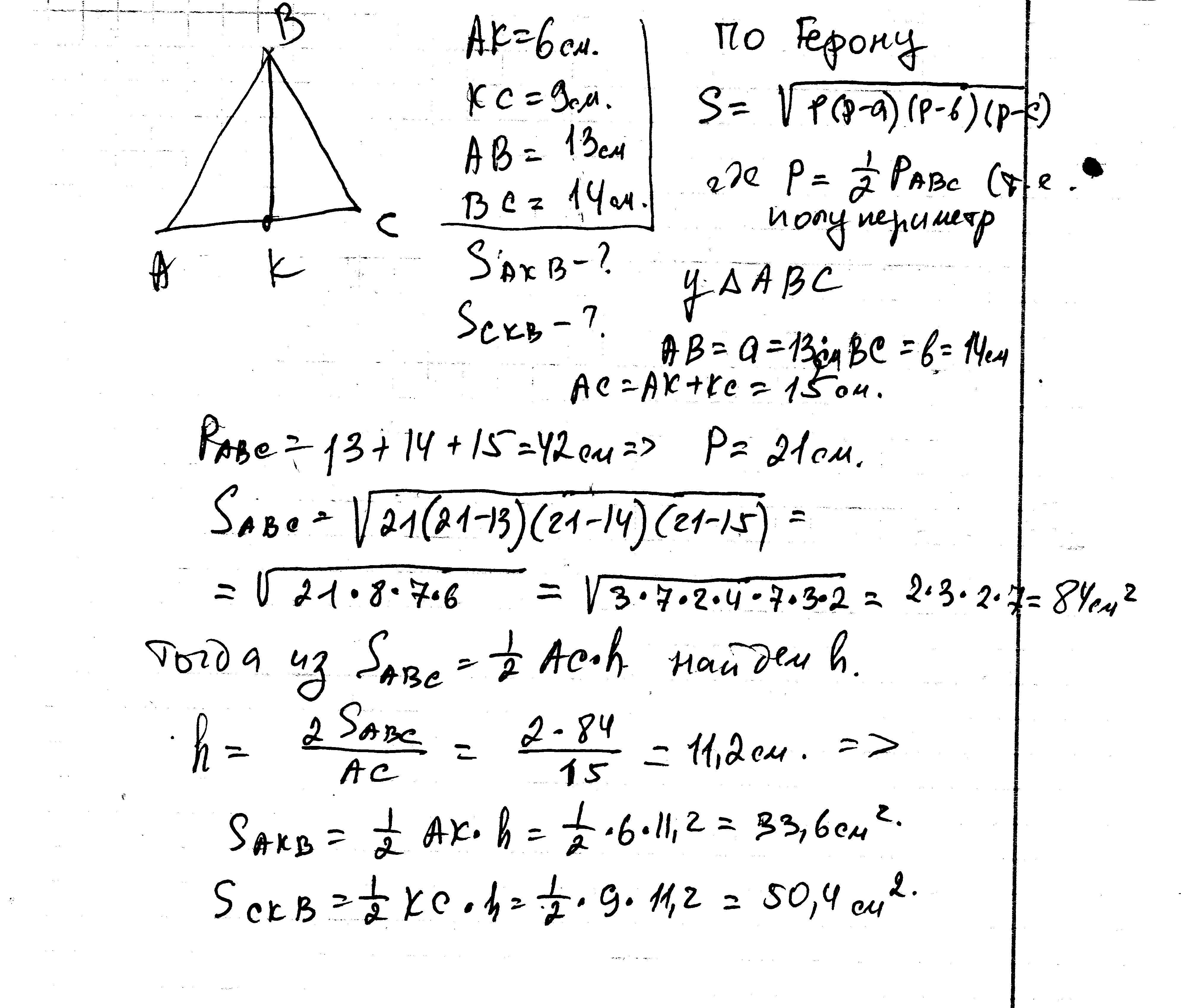 1)вычислите площадь трапеции АВСД с основаниями АД и ВС,если АД=24см.ВС=16см.угол А=45 градусов,угол Д=90градусов? 2)Дан треугольник АВС.На стороне Ас отмечена точка С так,что АК=6см.КС=9см.Найдите площади треугольников АВК и СВК,если АВ=13см,ВС=14см? РЕШИТЕ ПЖЛ.ТОЛЬКО БЕЗ СИНУСОВ!