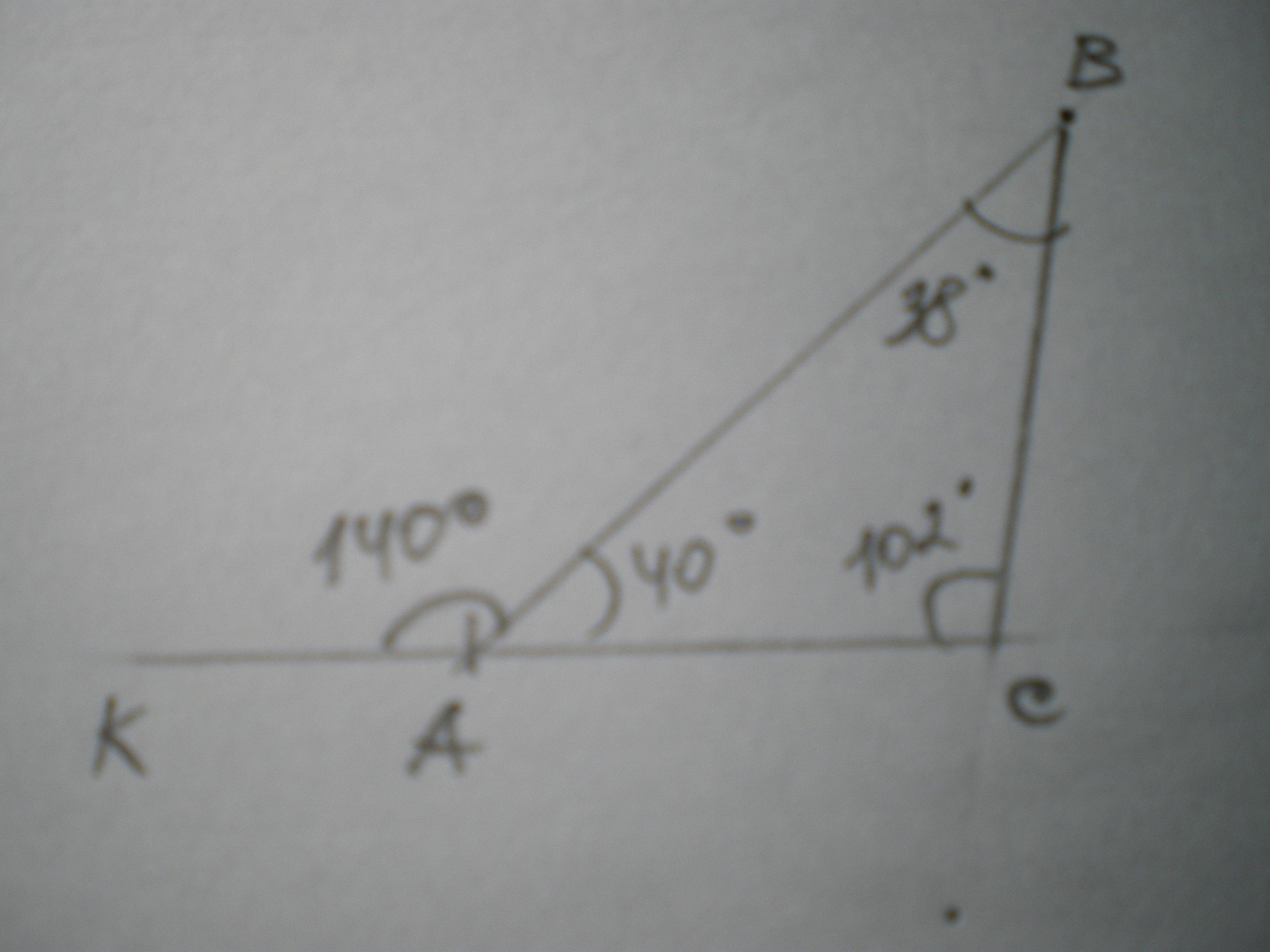 Нехай дано ΔАВС, ∠КАВ=140°, тоді ∠ВАС=180-140=40° (за властивістю суміжних кутів). ∠В=38° (за умовою), тоді ∠С=180-40-38=102°