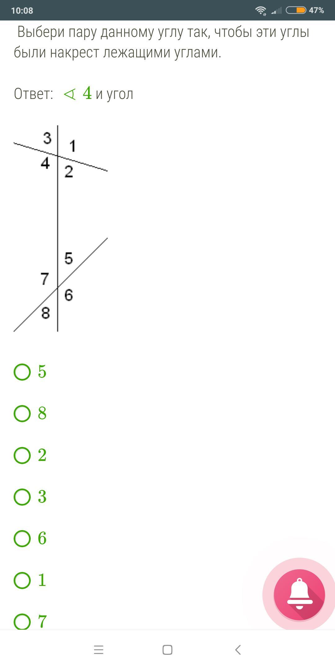 Выбери пару данному углу так, чтобы эти углы были накрест лежащими углами.