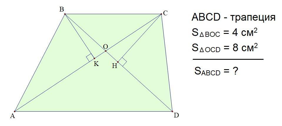 Дана трапеция ABCD(AD||BC), диагонали трапеции пересекаются в точке О. Sboc= 4 см², Scod= 8 см². Найдите площадь трапеции.