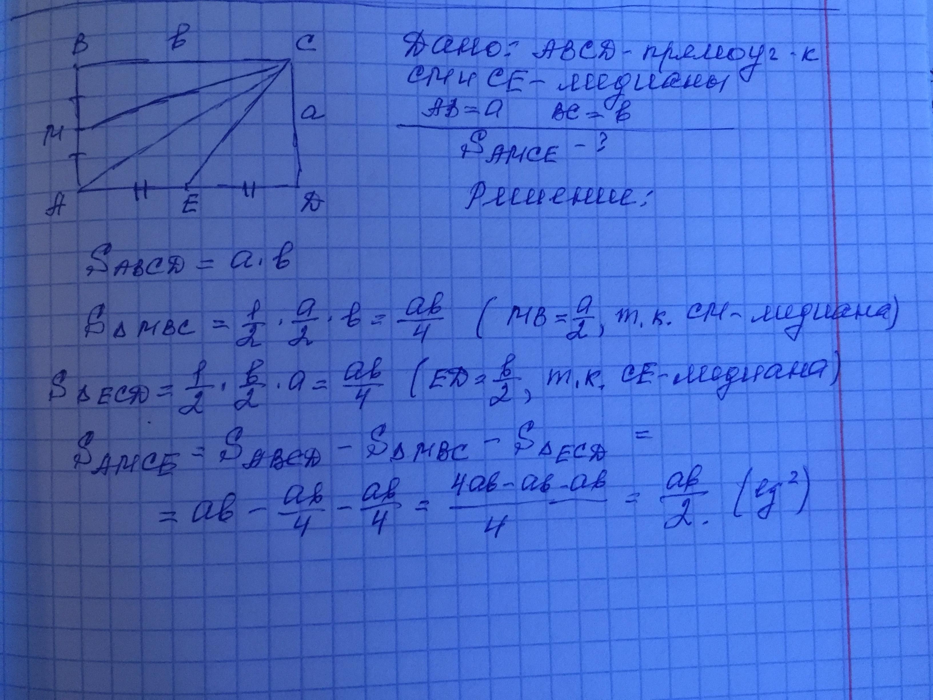 CM и CЕ – медианы треугольников, на которые прямоугольник ABCD разбивается диагональю АС. Вычислите площадь четырехугольника АМСЕ, если стороны прямоугольника равны соответственно a и b.