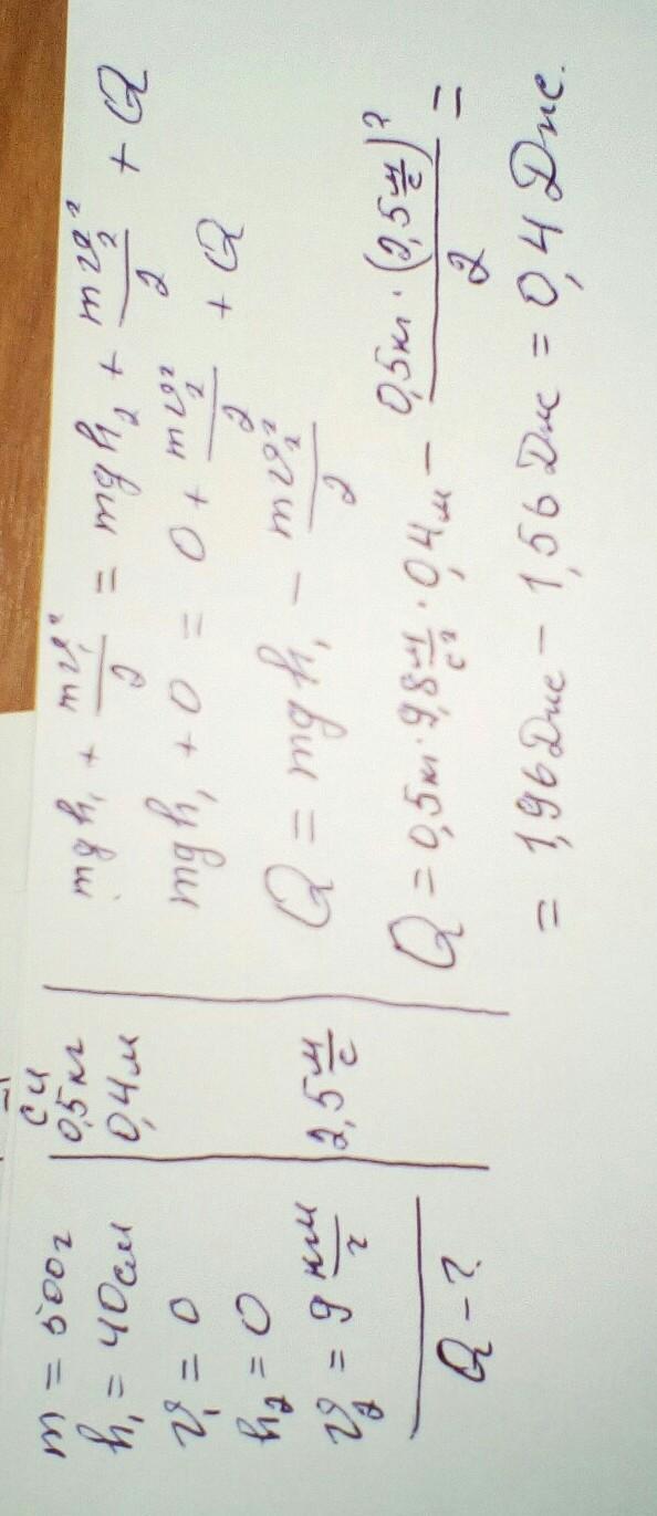 Тіло масою 500г ковзає з похилої площі висотою 40 см. Швидкість тіла в нижній точці площіни 9 км/год. Яка кількість теплоти в ділиться під час тертя, об площіну, якщо його початкова швидкість дорівнює 0.