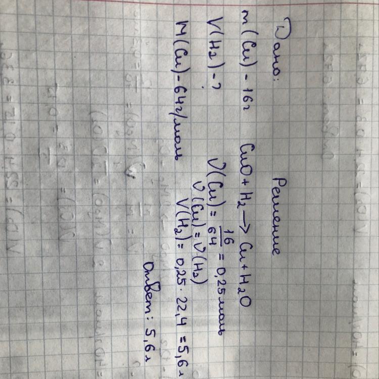 Рассчитайте, какой объем водорода должен вступить в реакцию с оксидом меди (II), чтобы образовалось 16 г меди
