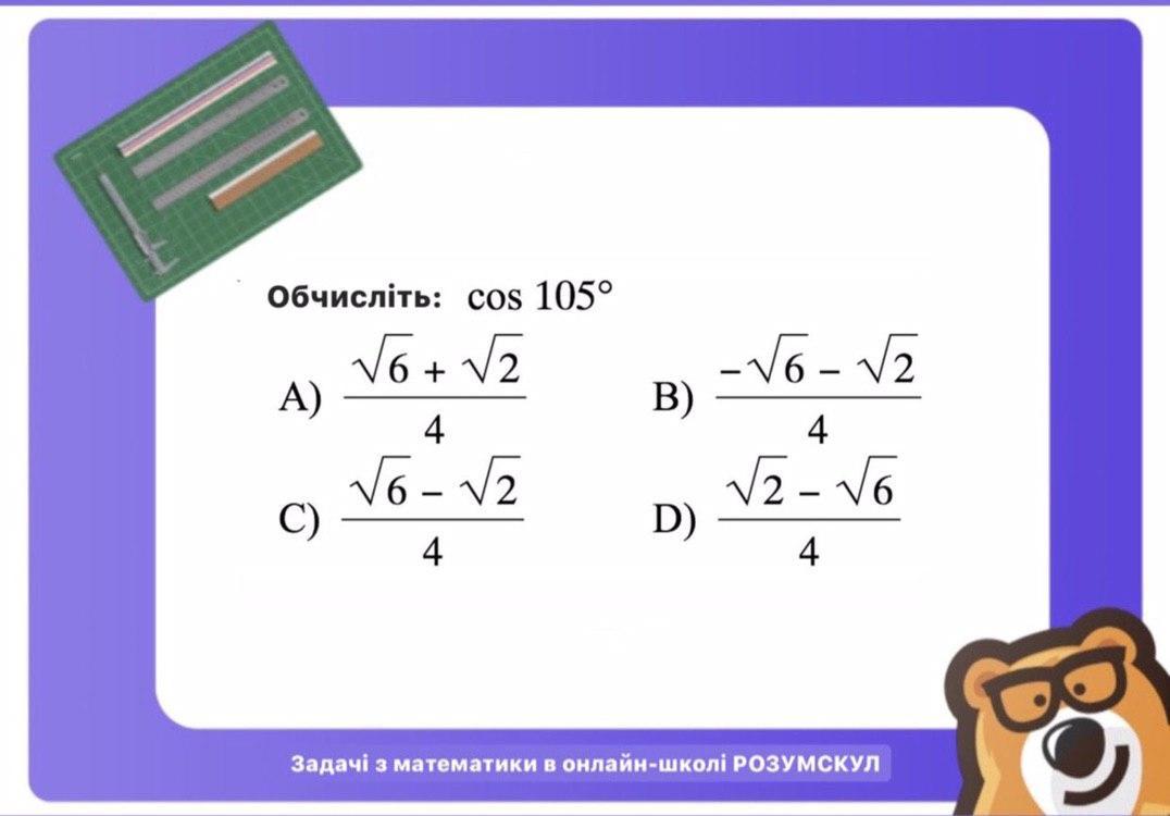 cos 105°=cos(60°+45°)=сos 60°*cos45°-sin60°*sin45°=1/2*√2/2-√3/2*√2/2=