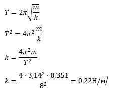 Период колебаний груза массой 351 г на пружине равен 8 с. Определи жёсткость пружины. При расчётах прими π=3,14.