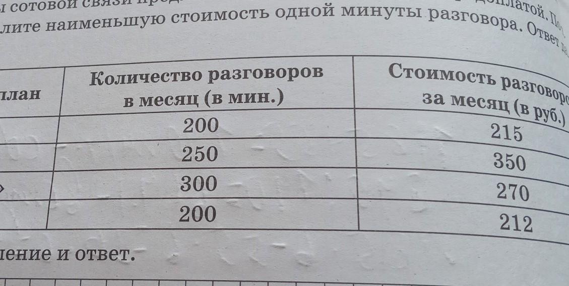 операторы сотовой связи предлагают тарифные планы с предоплатой по таблице Определите наименьшую стоимость одной минуты разговора Ответ дайте в рублях