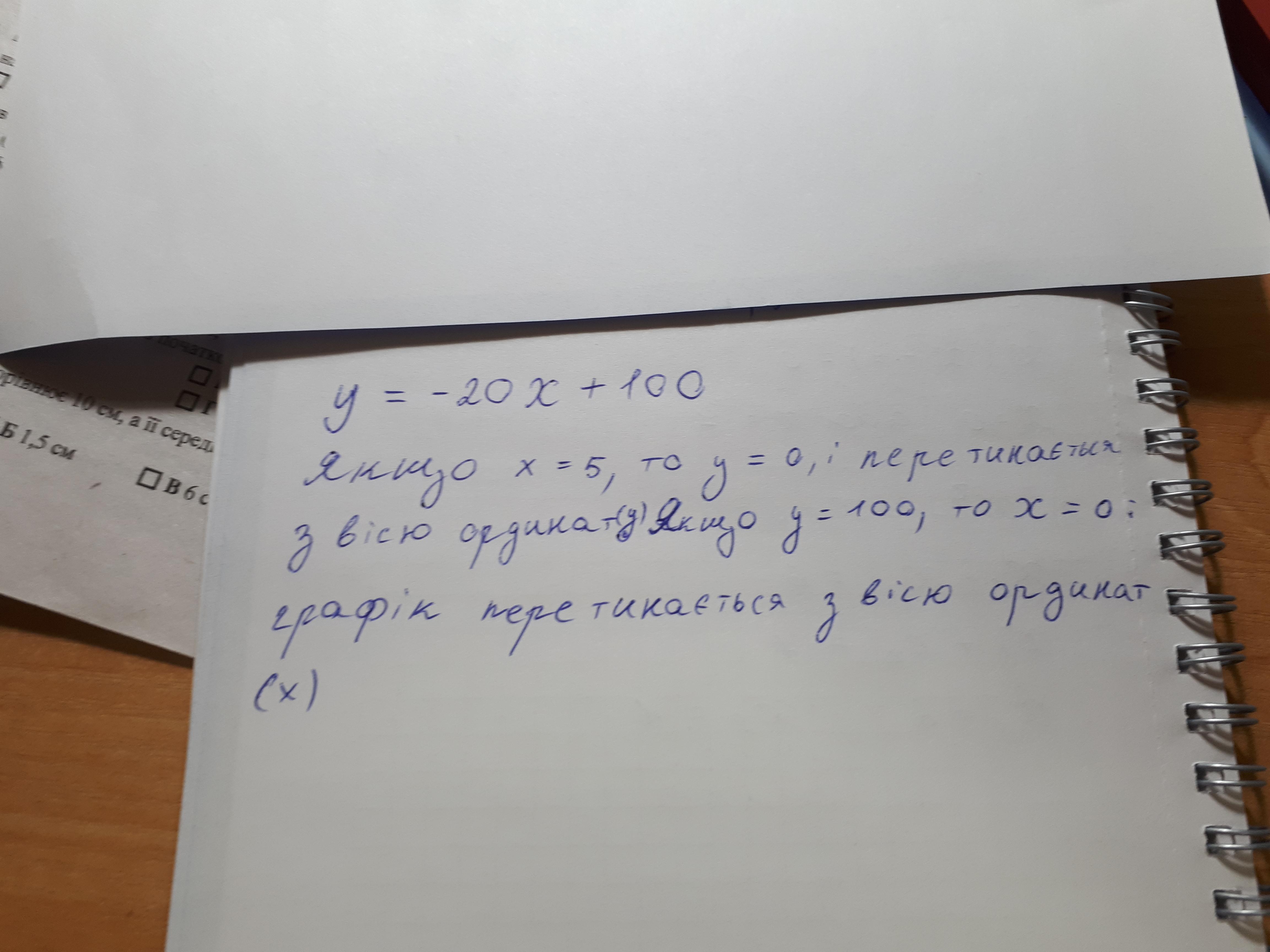 не виконуючи побудови знайдіть точку перетину з осями координат графіка функції у=-20х+100