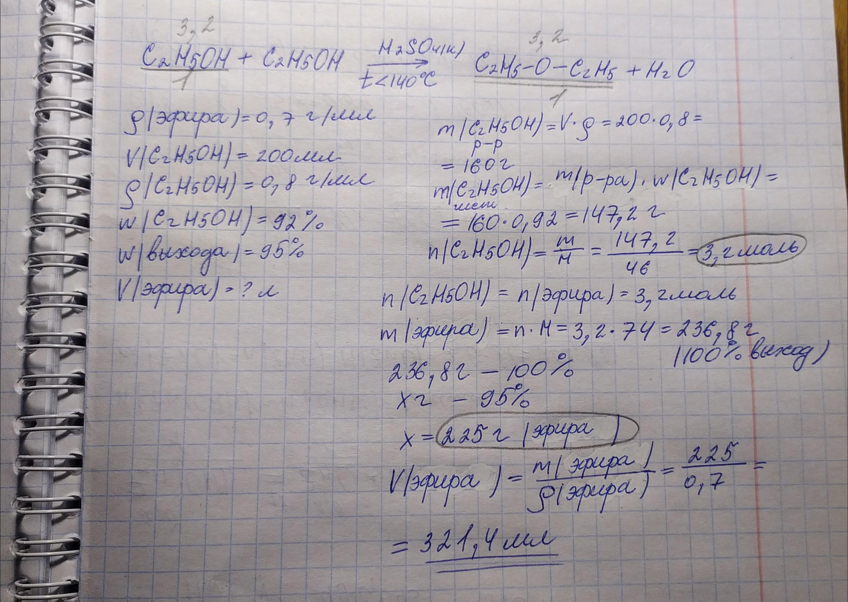 Какой объем диэтилового эфира плотностью 0,7 г/мл можно получить из 200мл. этилового спирта плотностью 0,8 г/мл с массовой долей 92%, если выход эфира составил 95%?