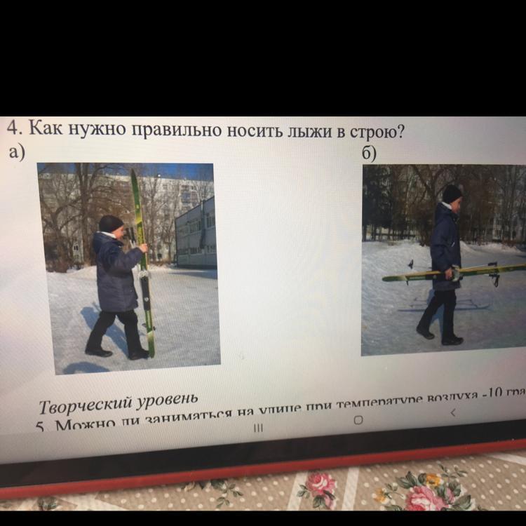 4. Как нужно правильно носить лыжи в строю?