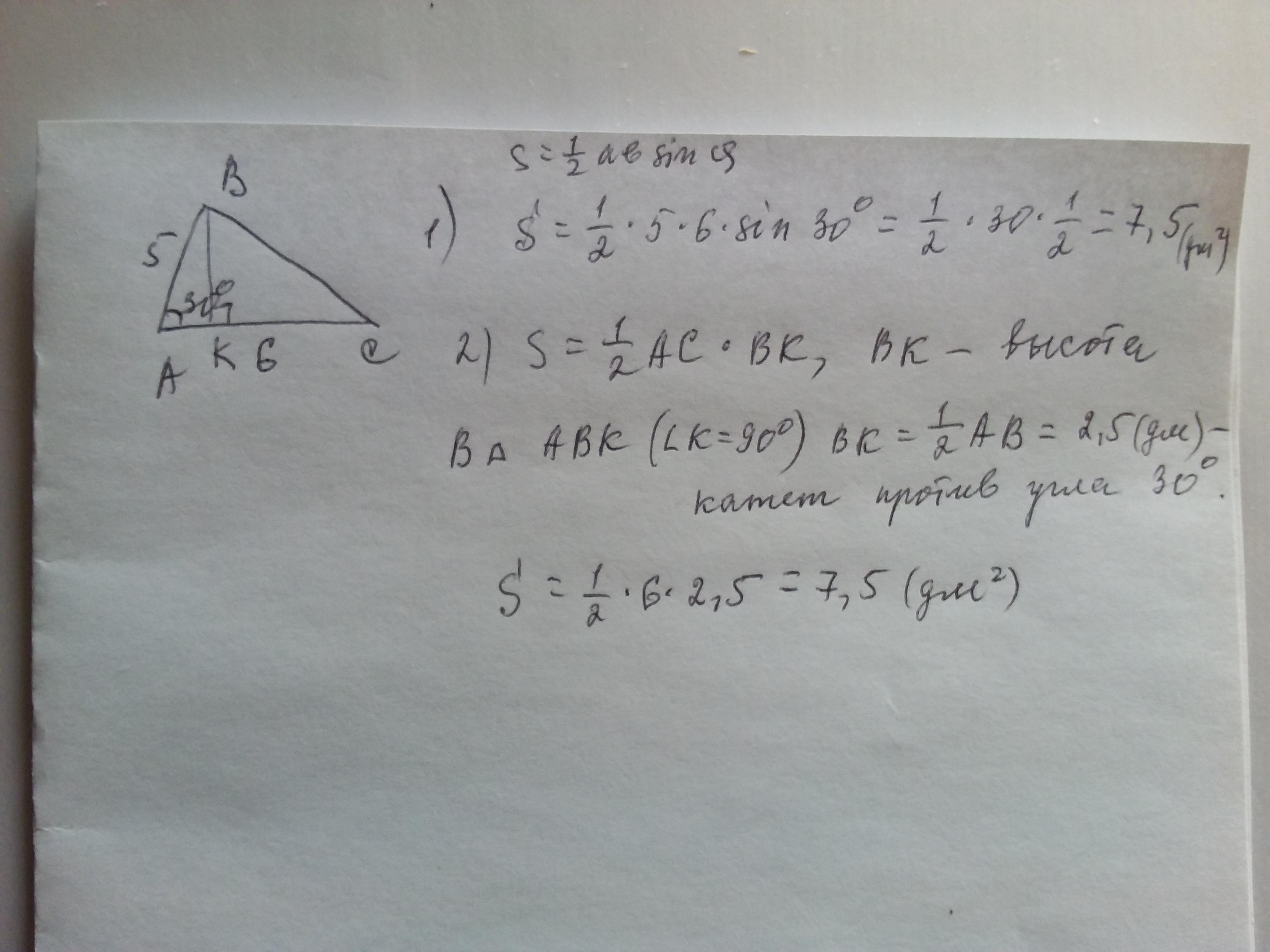 Найдите площадь треугольника, две стороны которого равны 5 дм и 6 дм , а угол между ними равен 30°.Решите двумя способами