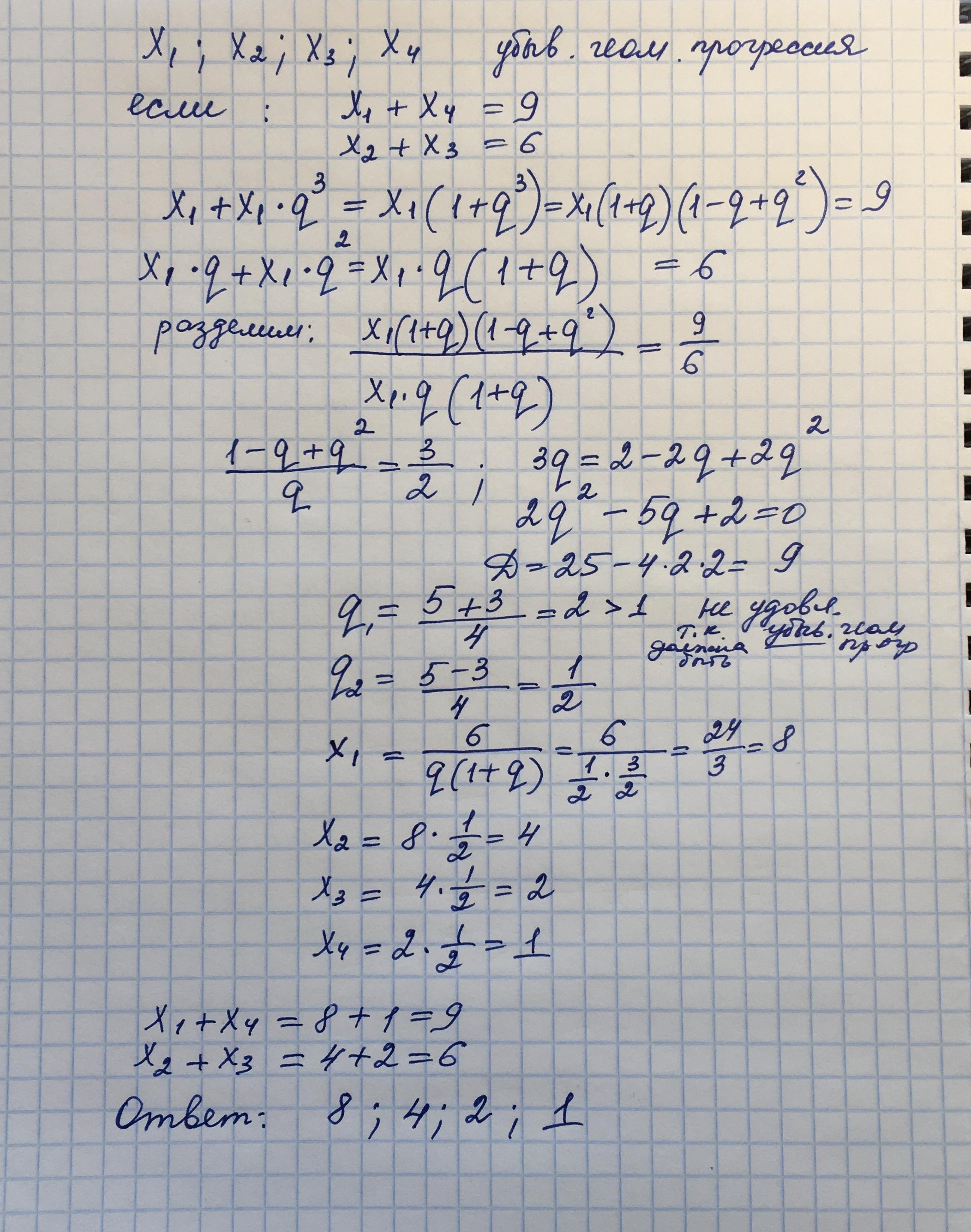 Найти 4 числа х1, х2, х3, х4,что образуют низходящую геометрическую прогрессию, если х1+х4=9, х2+х3=6.