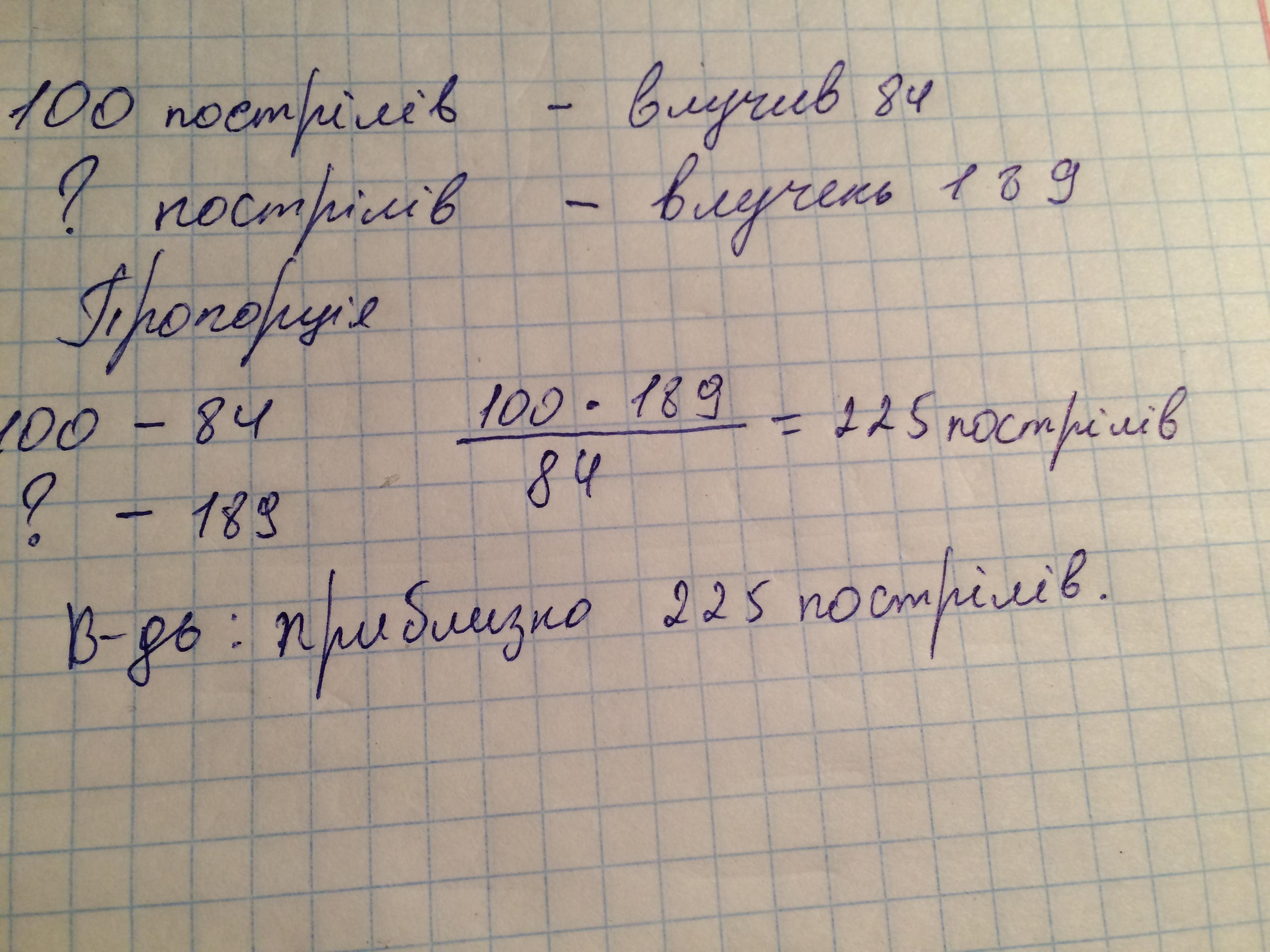у серії 100 стрілець влучив у ціль 84 рази. скільки приблизно пострілів зробивстрілець , якщо серед них було 189 влучень