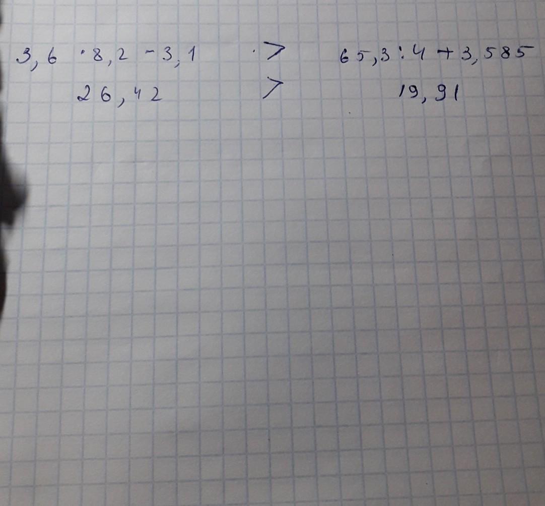 Сравнение выражение 3,6•8,2-3,1 и 65,3:4+3,585
