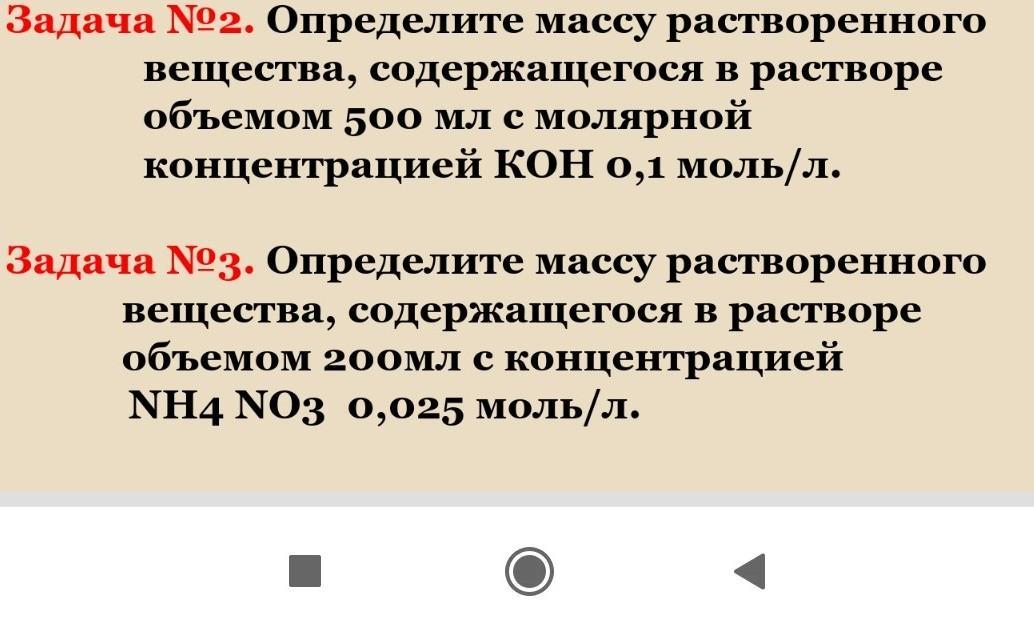 №2Ну смотри, так как тебе сказана молярная концентрация, то ты можешь найти количество вещества, затем умножив его на молярную массу найти массу. Т к 500 мл=1/2 литра. n(KOH)=0.05моль. М(КОН)=39+16+1=56