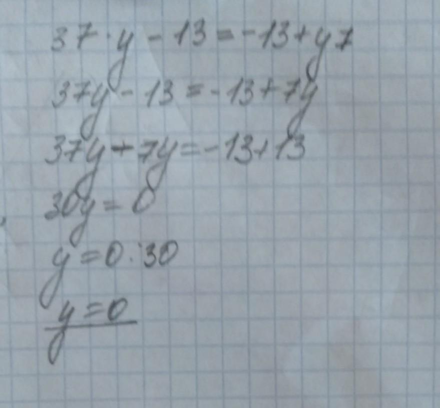 простите, я случайно забыла поставить дробь. Уравнение следующее: 3/7 * у - 13 = -13 + у/7