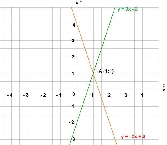 построить графики функций y=3x-2 , y=-3x+4 и найти координаты точки их пересечения