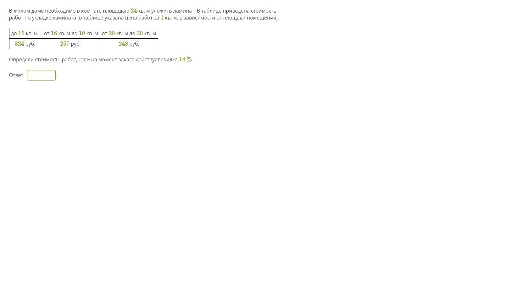 В жилом доме необходимо в комнате площадью 24 кв. м уложить ламинат. В таблице приведена стоимость работ по укладке ламината (в таблице указана цена работ за 1 кв. м. в зависимости от площади помещения).
