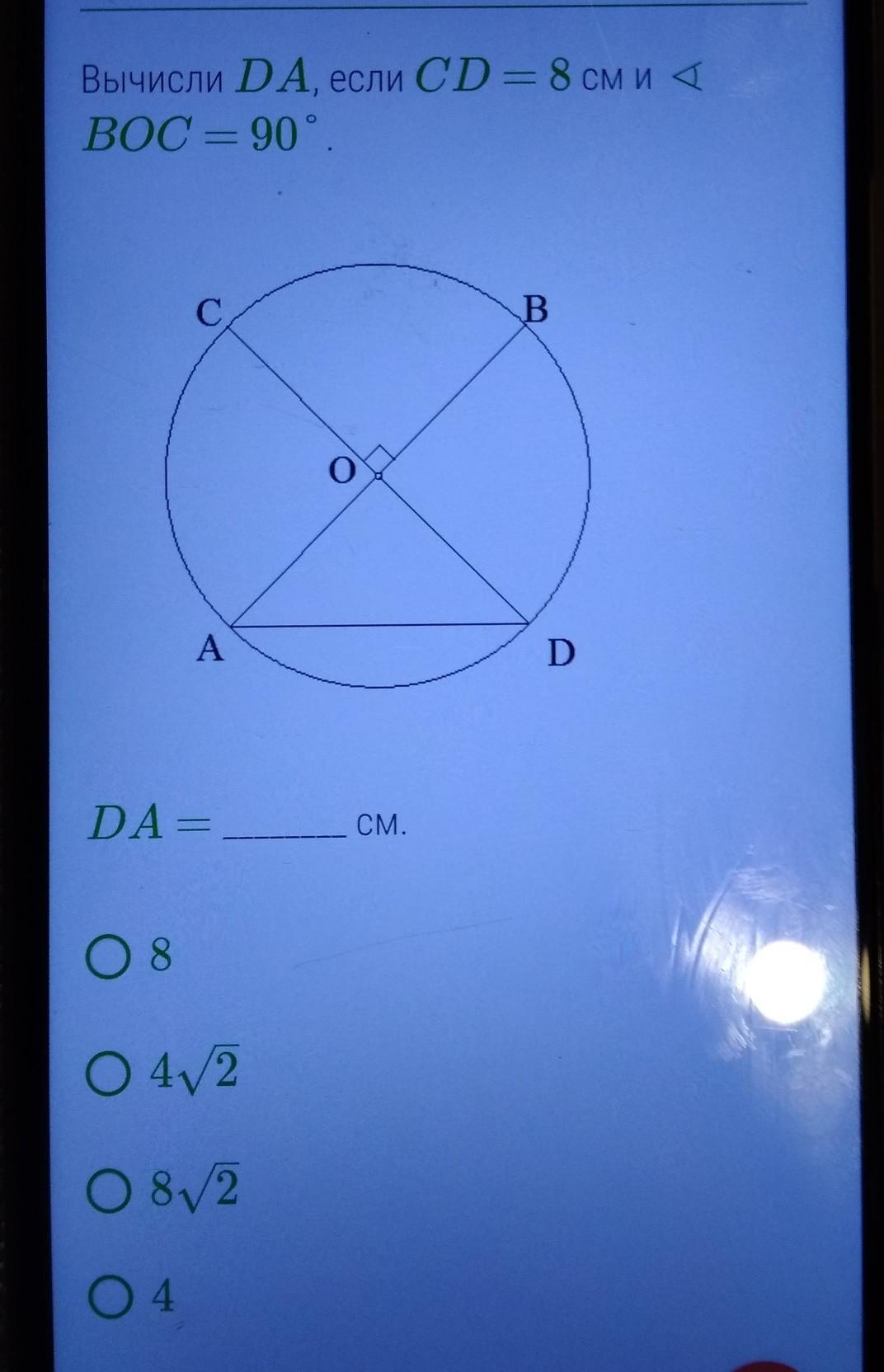 вычисли DA если CD=8см и угол BOC=90. Найдите DA=?