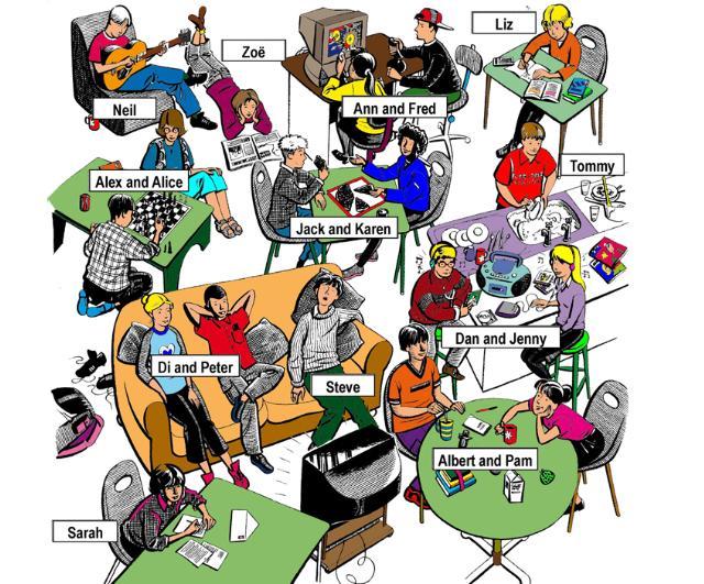 Описание картинки: Кто чем занимается? Составить предложения по картинке в Present Progressive.