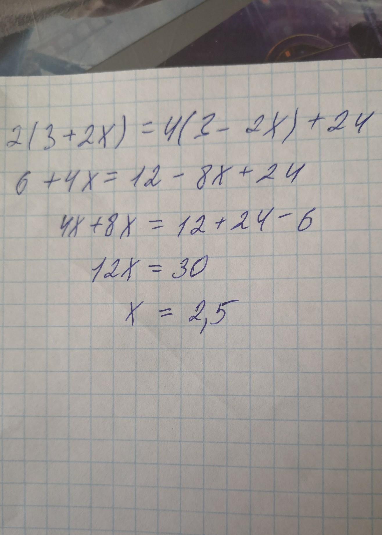 Решите уравнение 2(3+2x)=4(3-2x)+24