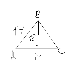 в равнобедренном треугольнике ABC боковая сторона AB=17см,медиана BM=18см найдите:основание
