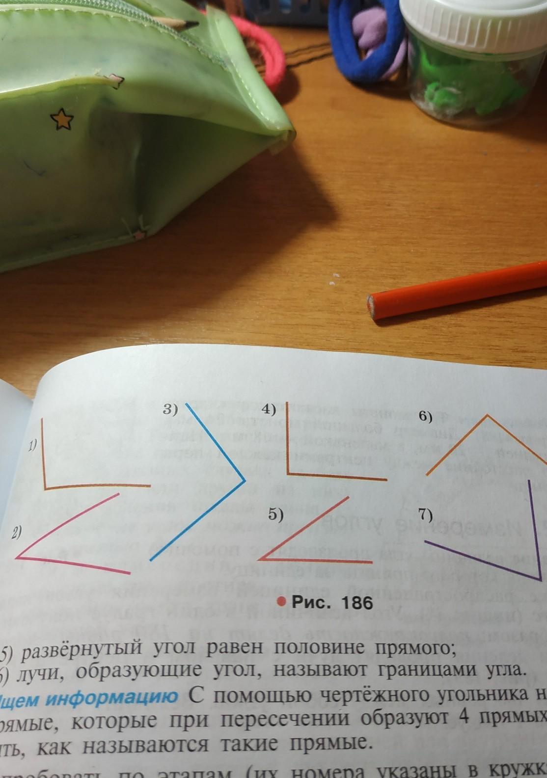 с помощью прямого угла чертёжного угольника Найдите на рисунке 186 острые тупые и прямые углы