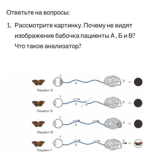 1. Рассмотрите картинку. Почему не видят изображение бабочка пациенты А, Б и В? Что такое анализатор ?