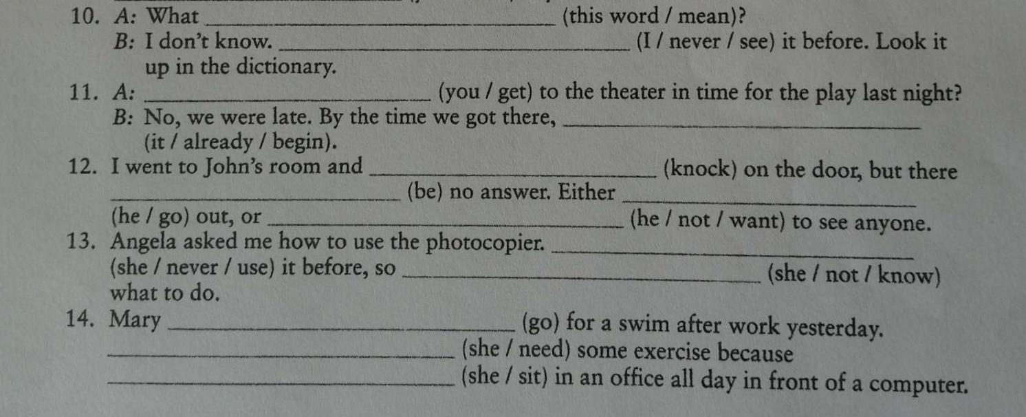 12. I went to John's room and _ _ (knocked) on the door, but there (was) no answer. Either (he had gone) out, or __ (he did not / want) to see anyone.