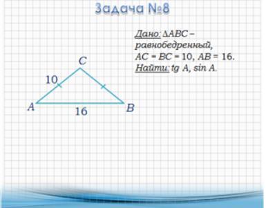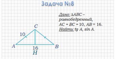 Задача: Дан ΔABC — равнобедренный, AC = BC = 10, AB = 16. Найти tg A, sin A.