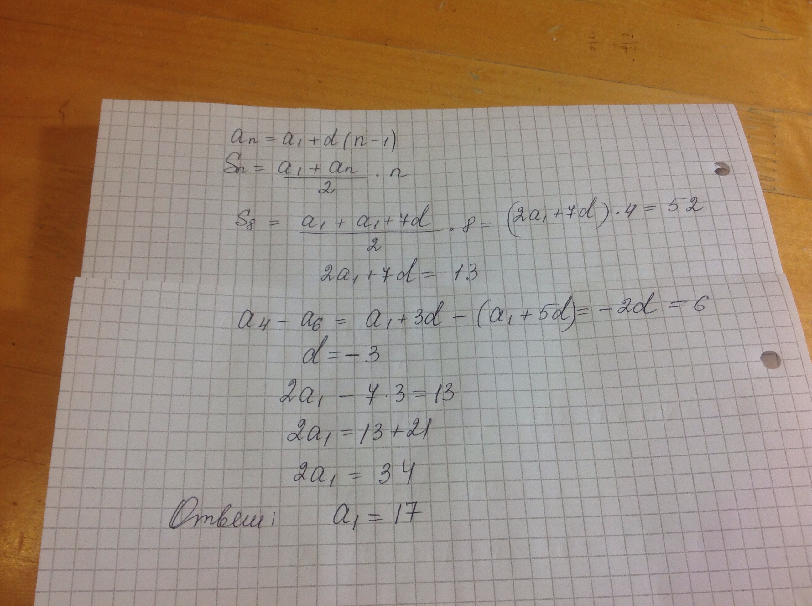 Сумма первых 8 членов арифметической прогрессии равна 52, а разность между 4-м и 6-м членами равна 6. Найдите первый член этой прогрессии
