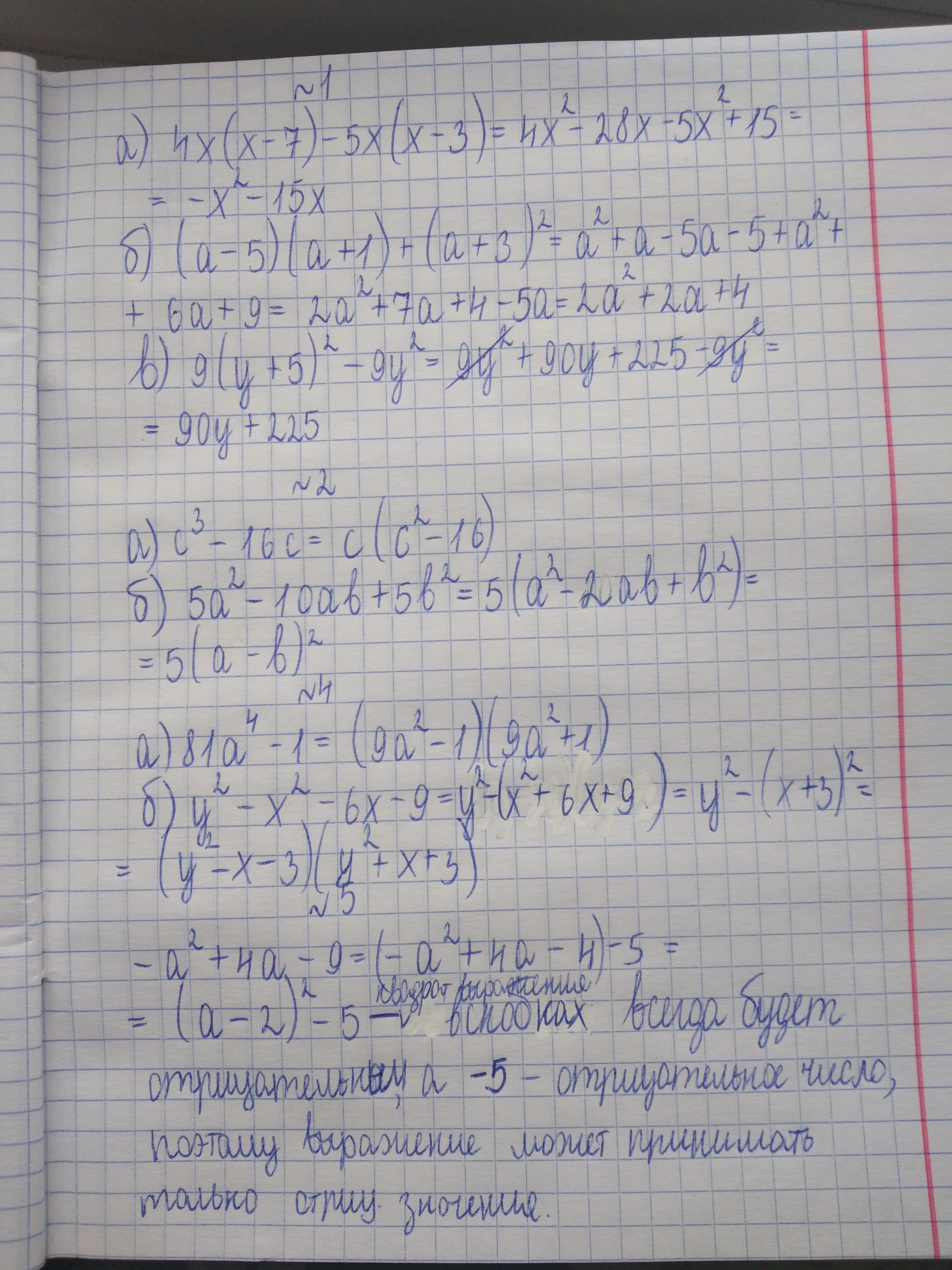 а) 4х (х – 7) – 5х (х - 3); в) 9 (y + 5)2 – 9y2.