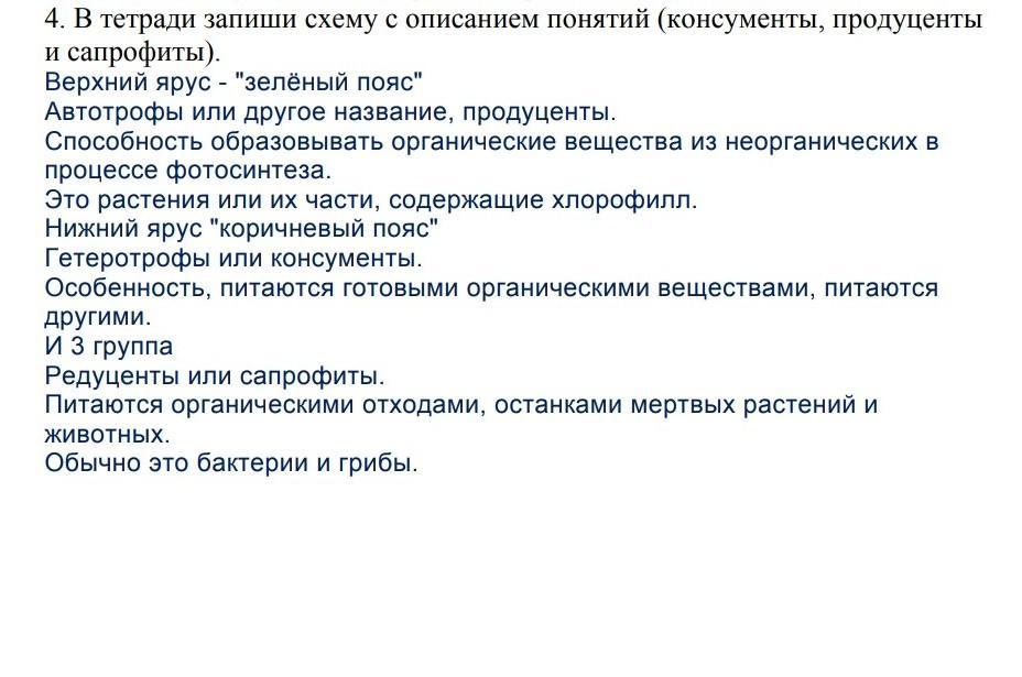в тетрадь запишите схему с понятием констументы продуценты и сапрофиты. Помогите пожалуйста!
