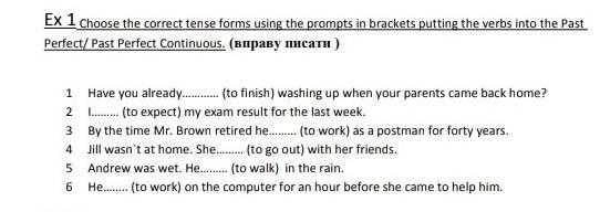1 finished 2 i have been expecting 3 had worked 4 went out/had gone out 5 had been walking 6 had been working