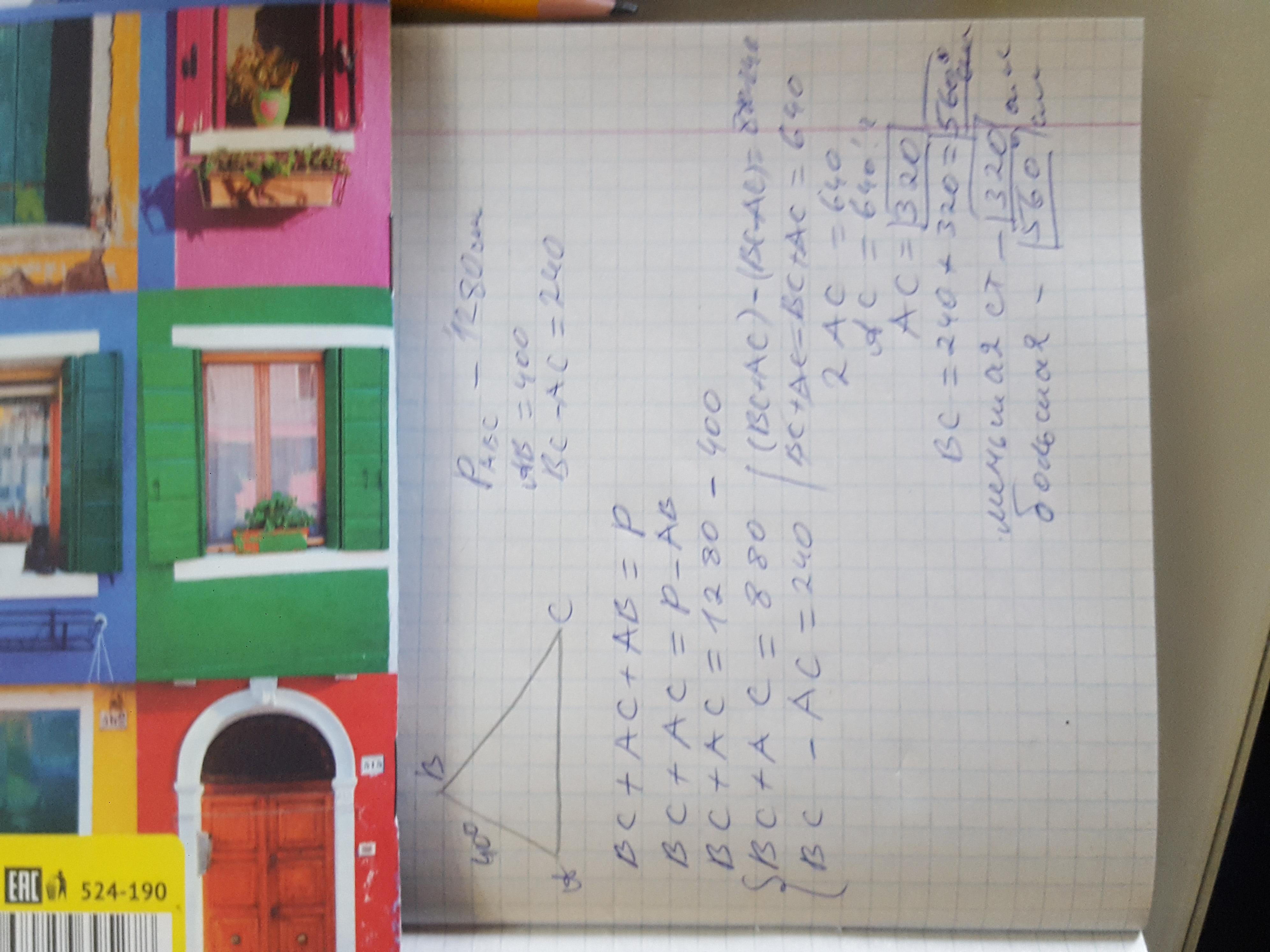 Периметр треугольника BAC равен 1280 см, одна из его сторон равна 400 см. Вычисли две другие стороны треугольника, если их разность равна 240 см.
