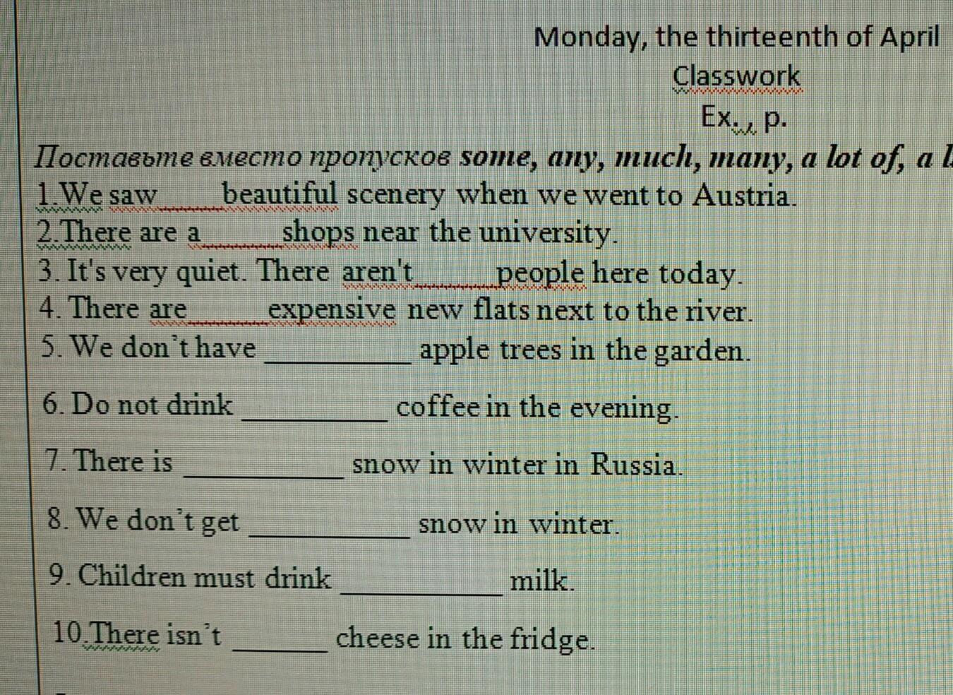 очень срочно , помогите написать!Поставьте вместо пропусков:some,any,much,many,a lot of,a little ,a few.СРОЧНО!