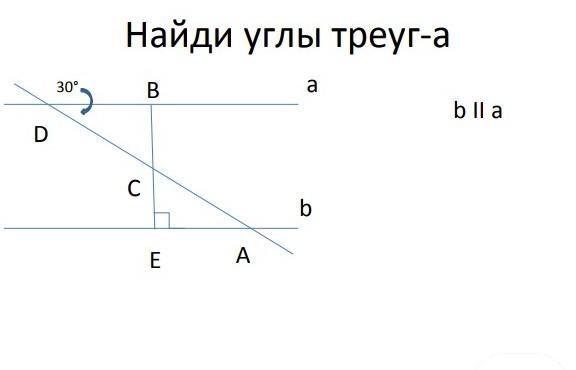 т.к. a||b, то накрест лежащие углы при секущей ВЕ равны: уголВЕА= уголЕВD=90°. Значит, ∆ DBC- прямоугольный. Если уголВDC=30°, то угол ВСD=90°-30°=60°.