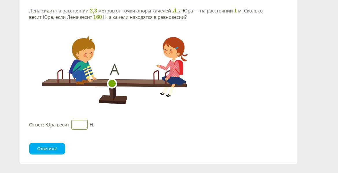 Лена сидит на расстоянии 2,3 метров от точки опоры качелей A, а Юра — на расстоянии 1 м. Сколько весит Юра, если Лена весит 160 Н, а качели находятся в равновесии?