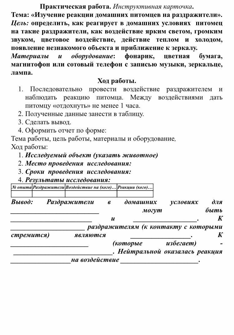 Вывод Мы научились определять Как реагирует в домашних условиях питомец На какие раздражители как воздействие ярким светом громким звуком световое воздействие действия теплом и холодом появление незнакомого объекта и приближения к зеркалу