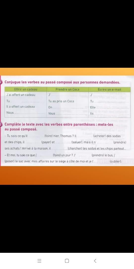 1. a fait 2. a achete 3. a paye 4. a salue 5. n'a pas pris 6. a cherche 7. f'ai fait 8. j'ai pris 9. j'ai pose 10. l'oublie