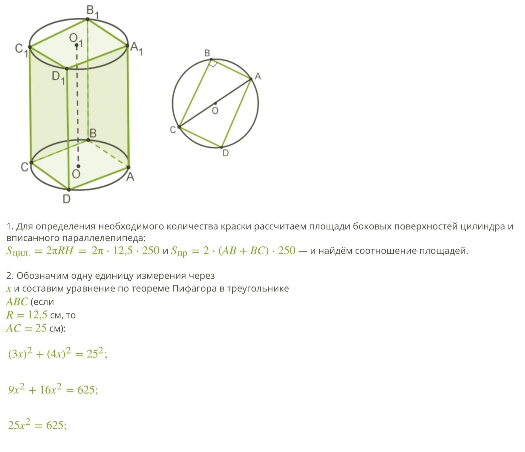 Диагональ такого сечения равна диаметру D исходного бревна, а так как нам известно соотношение сторон прямоугольника, то, обозначив их за 3х и 4х, получаем выражение (по т. Пифагора):