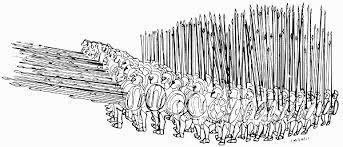 2) римское построения они шли вперёд с 1 рядом копьев. Тоесть у римлян был лишь один ряд копейщиков. Иногда они не использовали их. Они шли построением черепаха тоесть со всех сторон закрыты щитами.