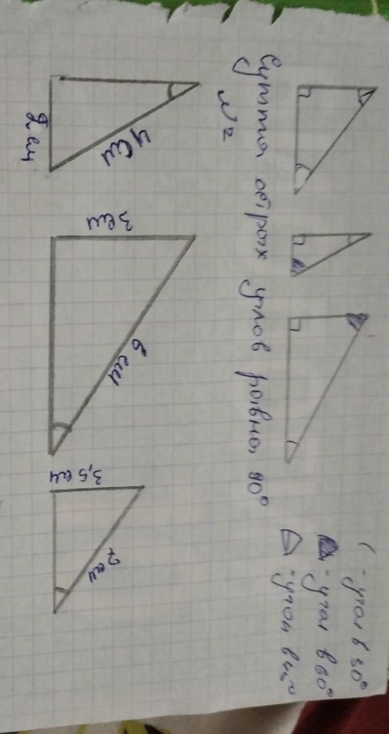 Начертите 3 прямоугольных треугольника и измерьте острые углы каждого транспортиром.