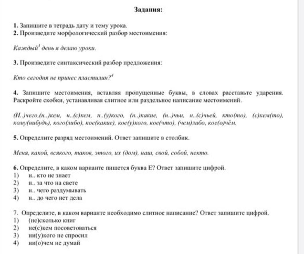 4. Ничего, никем, не с кем, ни у кого, никакие, ничьи, не с чьей, кто-то, с кем-то, кому-нибудь, кого-либо, кое-какие, кое у кого, кое-что, чем-либо, кое о чем.